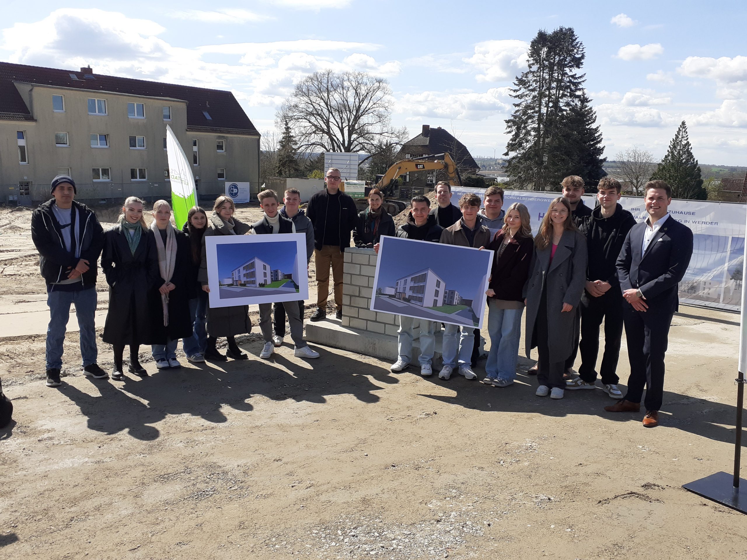 Wir, die Klasse IMK24‑1, waren heute zur Grundsteinlegung bei unserem Kooperationspartner, der kommunalen Haus- und Grundstücksgesellschaft Werder mbH, im Schwalbenbergweg eingeladen.